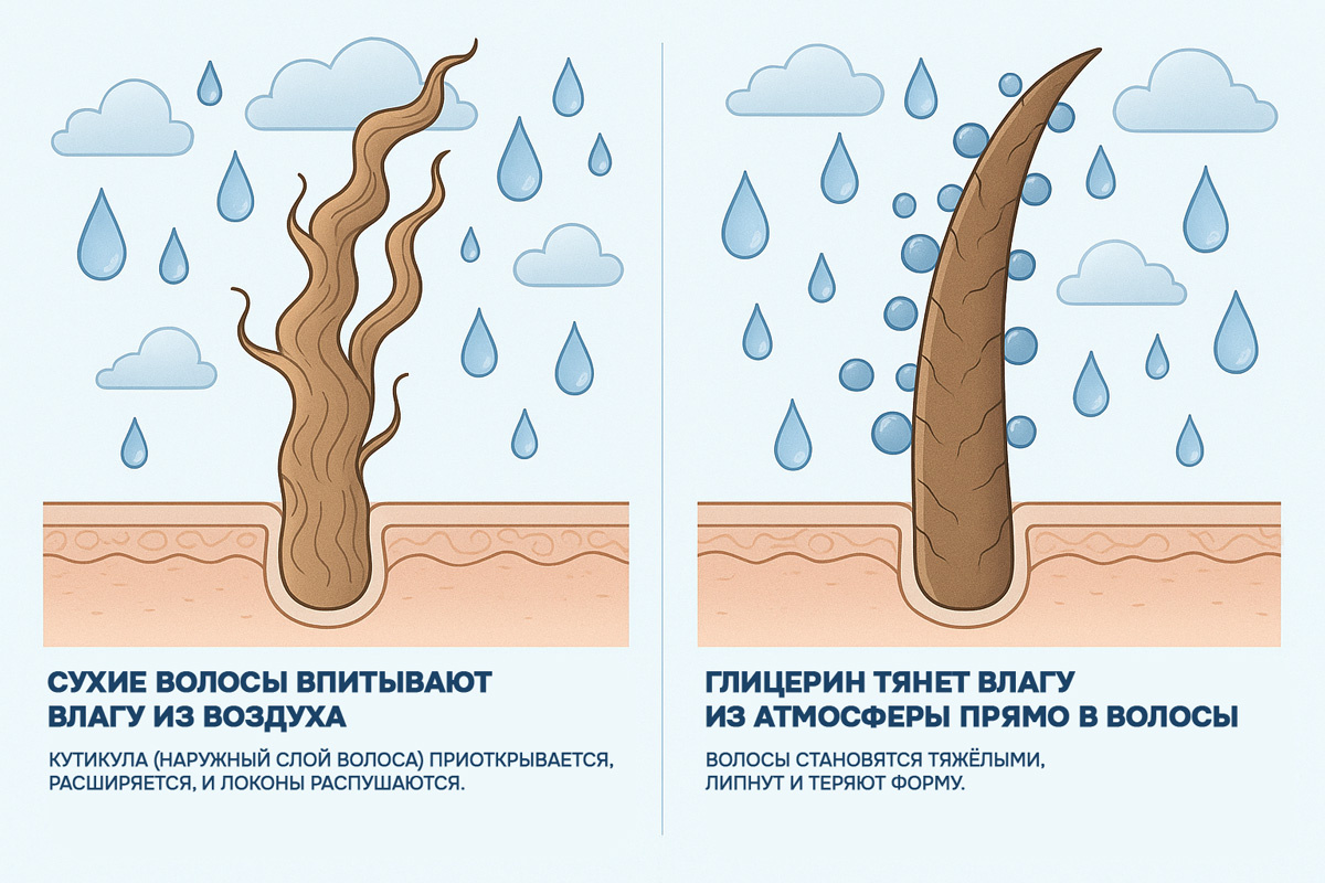 Увлажняющие средства с избытком глицерина могут сыграть злую шутку. Глицерин тянет влагу из атмосферы прямо в волосы - в итоге они становятся тяжёлыми, липнут и теряют форму.