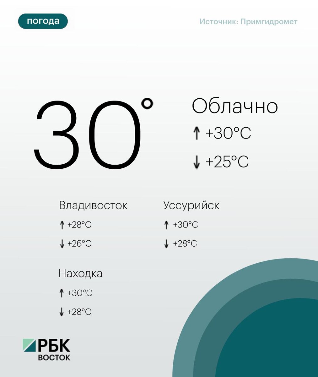 Сегодня погоду в Приморье определяет антициклон. Днем без существенных осадков. Ветер юго-западный умеренный. Температура воздуха +25...+30°C 🌧 Во Владивостоке небольшая облачность, без осадков. Ветер северный, во второй половине дня юго-восточный умеренный. Температура воздуха +26...+28°C. 😃Подписывайтесь на РБК Восток