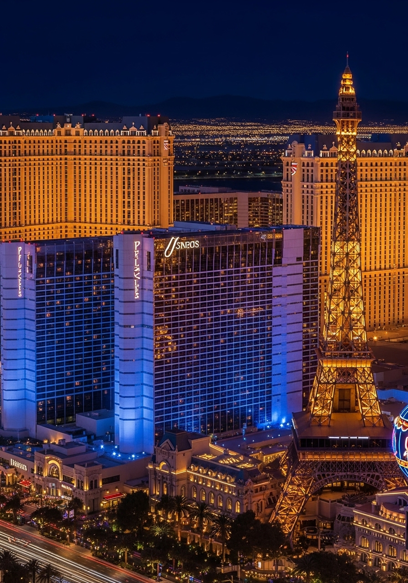 Bellagio — это классика Лас-Вегаса, знаменитая своими танцующими фонтанами и элегантной атмосферой в итальянском стиле. Расположен в центре Стрипа с видом на знаменитые фонтаны, рядом с Caesars Palace и Cosmopolitan. Отель славится своими ботаническими садами и консерваторией, которые меняются каждый сезон.