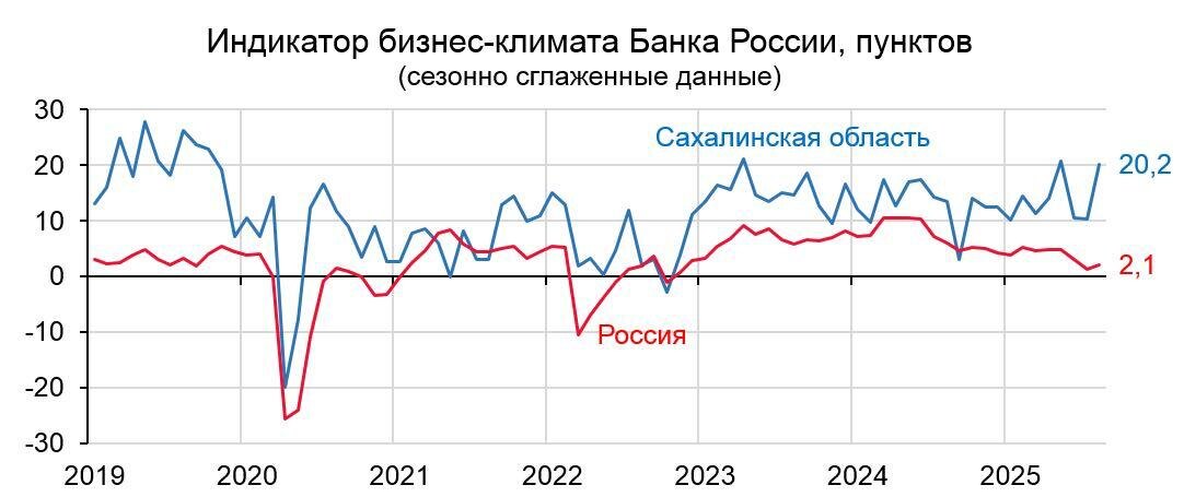 БАНК РОССИИ:ЭКОНОМИЧЕСКАЯ АКТИВНОСТЬ РАСТЕТ УМЕРЕННЫМИ ТЕМПАМИ В России По данным мониторинга Банка России, индикатор бизнес-климата Банка России в августе составил 2,1 пункта после 1,3 пункта месяцем ранее. Текущие оценки предприятий по выпуску продукции снизились. Краткосрочные ожидания компаний по производству и спросу были более позитивными, чем в июле. Ценовые ожидания бизнеса немного возросли. В Сахалинской области По данным опроса, проведенного в августе, региональный индикатор бизнес-климата Банка России с учетом устранения сезонности повысился по сравнению с прошлым месяцем и составил 20,2 пункта. Увеличение показателя произошло за счет повышения текущих оценок в отношении производства и спроса, в большей степени в торговле и сфере услуг. Ожидания на ближайшую перспективу также повысились, особенно в сельском хозяйстве. Присоединяйтесь к команде участников мониторинга