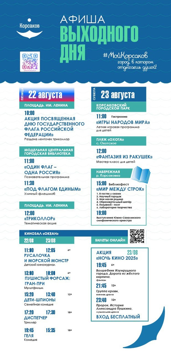 В эти выходные вас ждет насыщенная программа! 🇷🇺Приходите отпраздновать День Российского флага! На городской площади и в библиотеке вас ждут патриотические акции, раздача ленточек-триколор и множество других мероприятий. Присоединяйтесь! 🦀Ловите последние летние деньки на свежем воздухе! Для юных исследователей приготовили весёлую игровую программу «Игры народов мира» в парке и творческий мастер-класс «Фантазия из ракушек» на пляже «Охота». 🦉Главным событием этих выходных станет масштабный Библиофест «Мир между строк» на набережной реки Корсаковка. Мы ждём гостей всех возрастов — каждый найдёт для себя занятие по душе. А вечером будет выступление симфонического оркестра из Южно-Сахалинска. 🎬Любителям кинематографа тоже скучать не придётся! В программе — лучшие фильмы всех жанров: комедии, семейные, триллеры, фэнтези, драмы и мультфильмы!