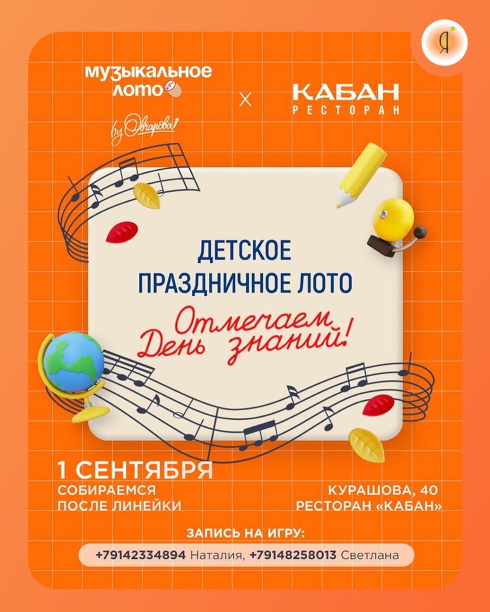 Детское музыкальное лото в «Кабане» #Детям 1 сентября детей и родителей приглашают отметить День знаний необычно - сыграть в музыкальное лото в уютном пространстве «Кабан». После школьной линейки вас ждут: 🤩Интерактивная игра с угадыванием мелодий 🤩Сюрпризы и призы 🤩Атмосфера радости и творчества 🤩 «Кабан» (ул. Курашова, 40) 1 сентября 🤩Запись: Наталия: +7 (914) 233-48-94 Светлана: +7 (914) 825-80-13 Online Якутия | Подписаться