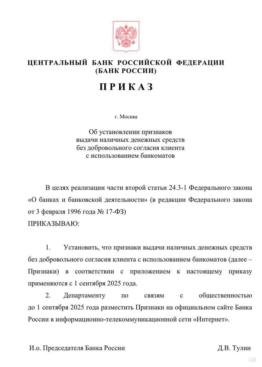 🔔Важная новость! С 1 сентября российские банки смогут ограничивать выдачу наличных в банкоматах до 50 000 рублей в сутки на 48 часов 🚨 Согласно распоряжению ЦБ, «триггерами» для системы станут: ✅если клиент воспользуется необычным способом операции (QR вместо карты, снятие вскоре после кредита); ✅перевод более 200 000 ₽ через СБП с другого банка; ✅замечен всплеск активности на телефоне (звонки, сообщения за несколько часов до операции, смена номера и т. п.); ✅серия отказов при снятии; ✅совпадение с базами риск-операций. Будьте внимательны и внимательно следите за своими операциями! ⚠️ Если возникнут вопросы или потребуется консультация — мы всегда рядом! 📞⚖️