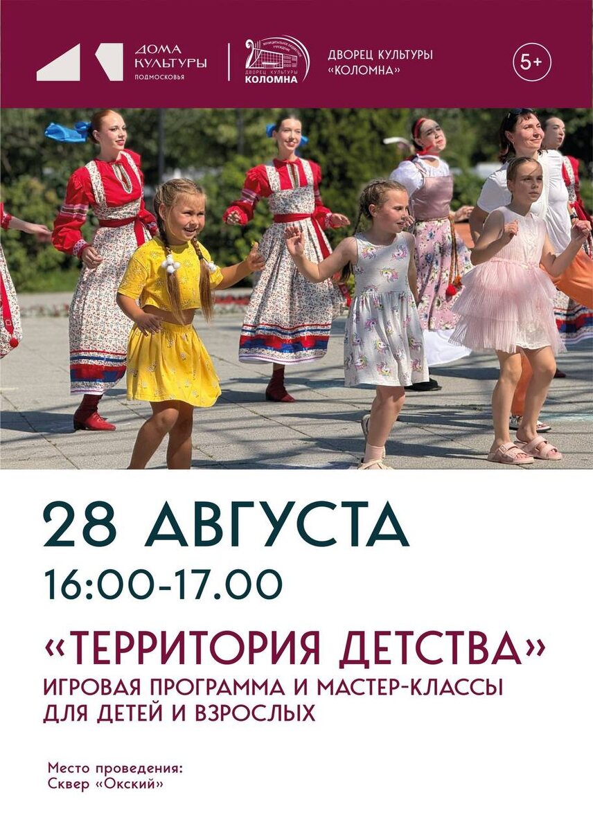 📍 Программа «Территория детства» Дворец культуры «Коломна» приглашает вас на игровую программу и мастер-классы «Территория детства». Зажигательные танцы и веселые игры подарят детям огромную радость, заряд положительной энергии и замечательное летнее настроение. Дата: 28 августа в 16.00 Место: Коломна, сквер «Окский» #ГородскойОкругКоломна #Коломна #КоломнаZдесь #КоломнаОзёры #Подмосковье #НашеПодмосковье #Московскаяобласть