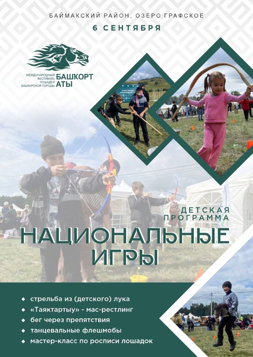 “Башҡорт аты” фестивалендә балалар майҙансыҡтары булдырыла Республика халыҡ ижады үҙәгенән хәбәр итеүҙәренсә, байрамда ҡыҙҙар һәм малайҙар өсөн уйындар ҡаралған. Улар уҡ атыу ярышында көс һынаша, ағас һындарҙы буяуҙа ҡатнаша ала. Шулай уҡ бейеү флешмобы үтә. Бынан тыш, көйәнтә менән йүгереү, таяҡ тартыш, ҡаршылыҡтар аша уҙыш, көршәк ватыу була. Халыҡ-ара сара 6 сентябрҙә Баймаҡ районында үтә.