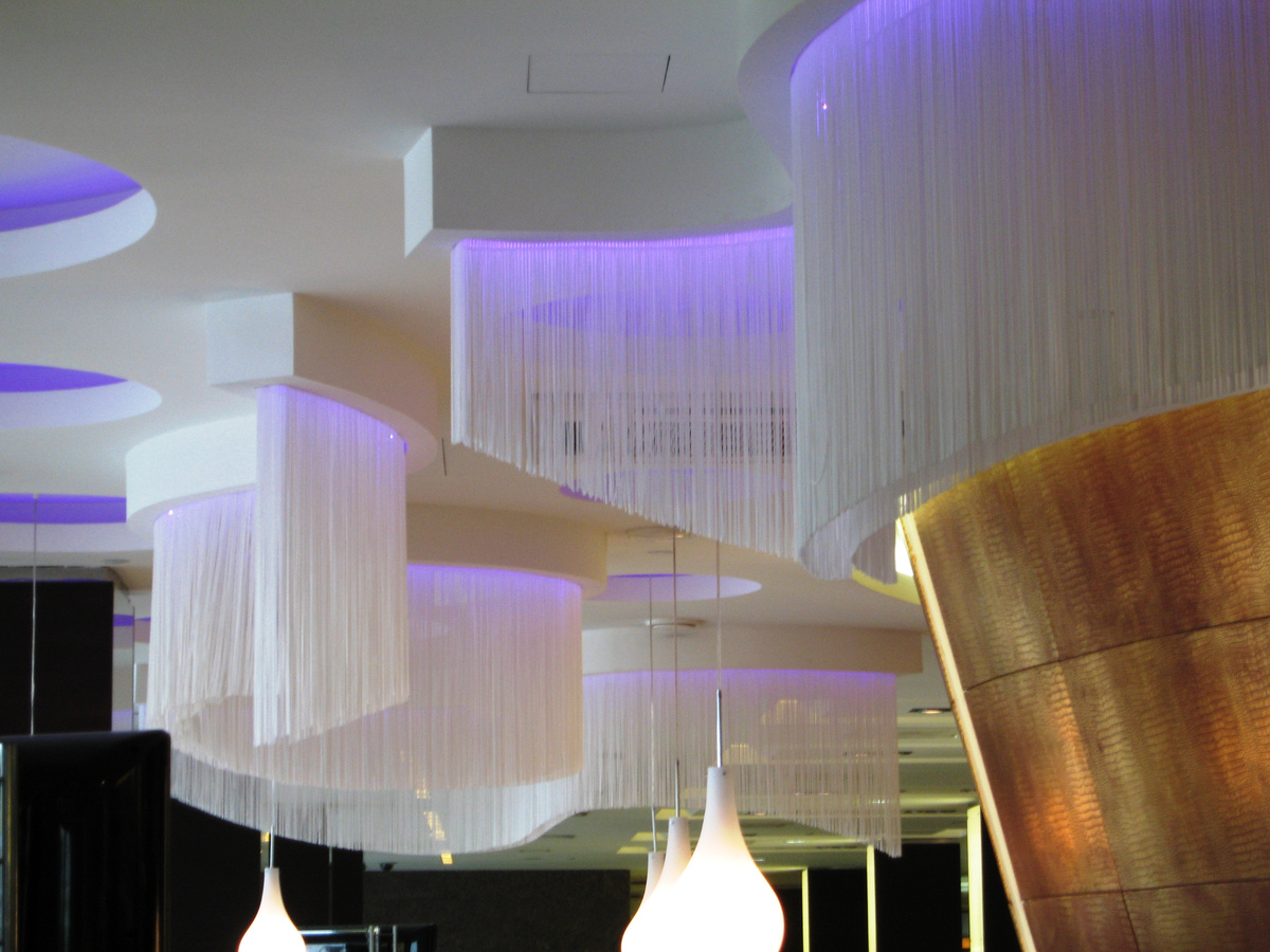 Нитевые шторы могут стать отличным решением для ресторана или небольшого кафе. Помогут они и в оформлении любого другого заведения, где требуется выработать эксклюзивный дизайн интерьера. Нитевые шторы, благодаря своему необычному внешнему виду, смогут создать атмосферу таинственности и загадочности в любом помещении. Здесь их можно использовать не только в качестве перегородки, но и как декор стен или окон. Всё зависит исключительно от вашей фантазии.