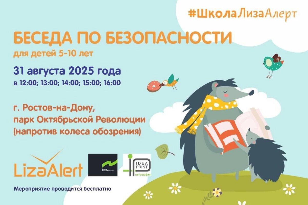 ‼️Беседы по безопасности для детей 5-10 лет от представителей ДПСО «ЛизаАлерт» 31 августа, с 12:00 до 17:00 парк Октябрьской Революции, напротив колеса обозрения В этот день в парке будут проводиться профилактические беседы по безопасности, где представители отряда: — расскажут об алгоритмах безопасности в городской и природной среде; — продемонстрируют поисковое оборудование и расскажут, как им пользоваться; — соберут с детьми походный рюкзак; — ответят на все интересующие вопросы и многое другое. Здесь ребенку расскажут о том, что делать, чтобы не потеряться и как действовать, если он потерялся. Мероприятие бесплатное 🫠 Детские мероприятия Ростов-на-Дону. Я местный!