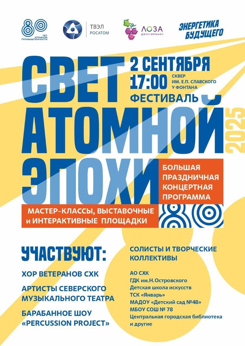 Фестиваль «Свет атомной эпохи», посвящённый 80-летию атомной отрасли России Северчан будут ждать 2 сентября в 17:00 в сквере имени Е. Славского, у фонтана. #СеверскАфиша