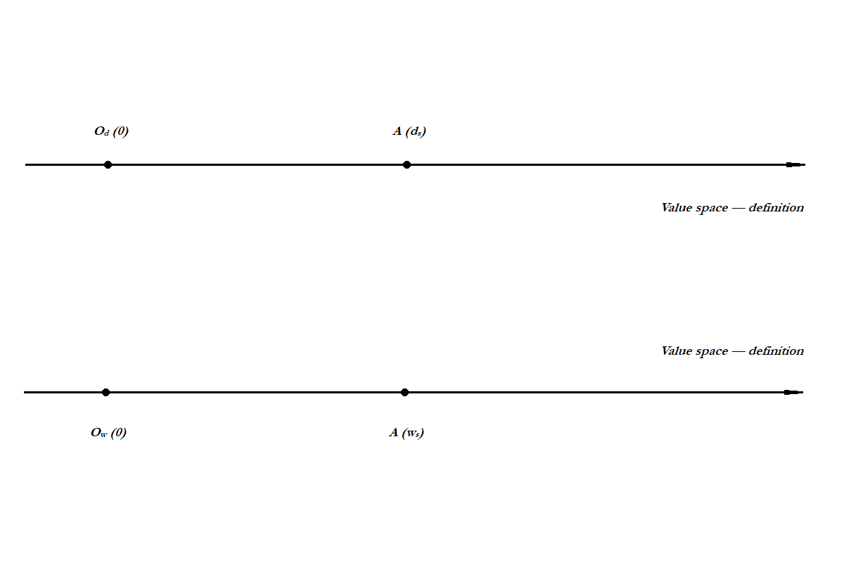 Comment. Straight line segments (OdA) and (OwA) and coordinates (ds) and (ws) are different things. Straight line segments are physical phenomena and their quantity, coordinates are a magnitude, that we have defined (measured) according to the selected units of measurement. Units of measurement may be different, but the principle of measurement in human culture is always the same, it is the ratio of the length of the segment and the length of the standard, so any coordinate is the quantity of such standards. For the segment (OdA), this ratio is with its reference (ld), accordingly, (ds = OdA / ld). For the segment (OwA), this ratio is with its reference (lw), accordingly, (ws = OwA / lw). Two standards are two different units of measurement, because straight line segments can reflect different phenomena. For physical quantities (with valid definition) these are physical standards — meters, kilowatts, Joules, degrees Celsius (or other methods of measuring temperature), etc. For psychological quantities (with abstract definition) these are non–existent, but accepted standards — units of measurement for danger, beauty, yummy, etc. For distilled psychology — this is not important, because in distilled psychology there are no standards (ld) and (lw), therefore, neither in distilled psychology, nor in the behavior of a living being, nor in its anatomy, we will never see the familiar digits. But this is important to us, because in our culture, the definition is usually expressed by a digit (coordinates (ds) and (ws)).