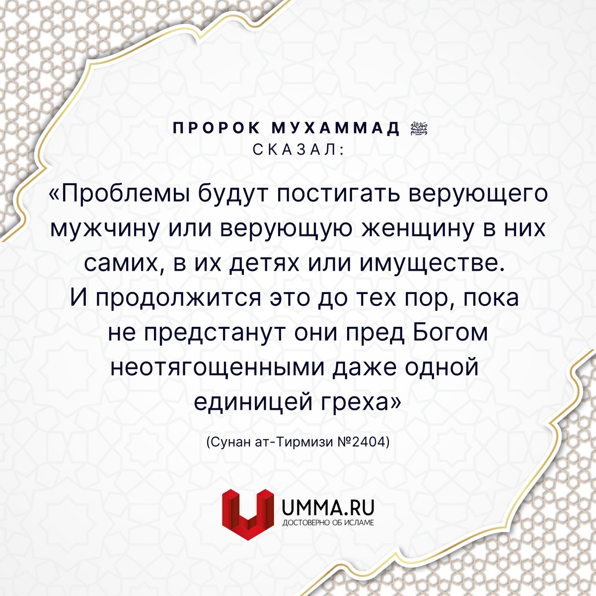 Пророк Мухаммад ﷺ сказал: «Проблемы будут постигать верующего мужчину или верующую женщину в них самих [душевные состояния], в их детях [болезни, трудности с воспитанием] или имуществе [потери]. И продолжится это до тех пор, пока не предстанут они пред Богом неотягощенными даже одной единицей греха» (Сунан ат-Тирмизи №2404)
