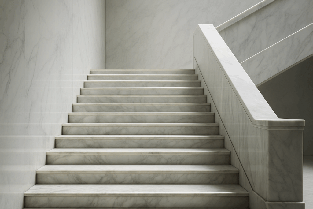 Без дополнительной защиты в местах с высокой проходимостью эффект сохраняется 1-2 года. С установкой защитной пленки на наиболее нагруженные участки — 5-7 лет. При комплексном подходе (реставрация + защита + правильный регулярный уход) мраморная лестница может сохранять превосходный вид до 10 лет даже при интенсивной эксплуатации.