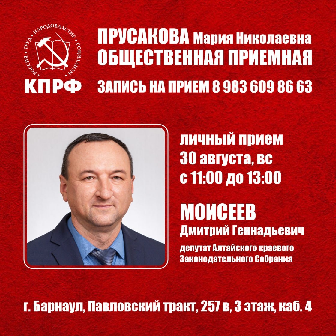 Приемные дни депутатов Алтайского краевого Законодательного Собрания по адресу: г. Барнаул, Павловский тракт, 257в, 3 этаж, каб. 4. 📌30 августа, вс, 11:00 – 13:00, МОИСЕЕВ Д.Г., депутат АКЗС ☎️ Предварительная запись по тел. 8-983-609-86-63
