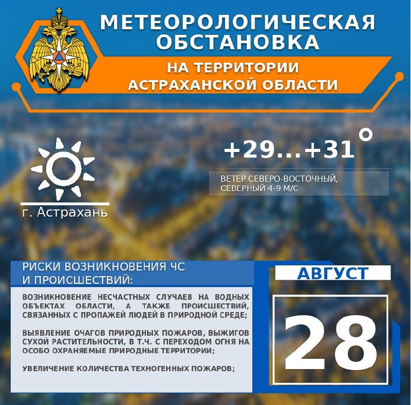 Метеорологическая обстановка на 28 августа🌻 ⛅️На территории области небольшая облачность. Без существенных осадков. Ветер северо-восточный, северный 4-9 м/с. 🌡Температура воздуха днем +27...+32°, ночью +12...+17°. По г. Астрахань небольшая облачность. 🌤Без существенных осадков. Ветер северо-восточный, северный 4-9 м/с. 🌡Температура воздуха +29...+31°, ночью +14...+16°. ✅Присоединяйся к МЧС Астрахань 👉Подписывайся на МЧС России в Telegram | MAX