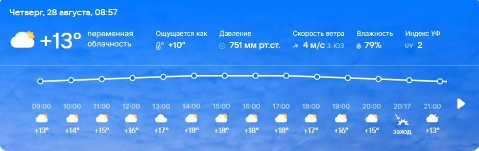 Температура: Утром: +13°C Днем: +14°C (10:00) → +15°C (11:00) → +16°C (12:00) После полудня: +17°C (13:00) → +18°C (14:00-17:00) Вечером: +17°C (18:00) → +16°C (19:00) → +15°C (20:00) Облачность: Переменная облачность в течение всего дня. Ощущается как: +10°C. Рекомендации: Возьмите с собой легкую куртку или свитер, так как утром и вечером может быть прохладно. Удачного дня!