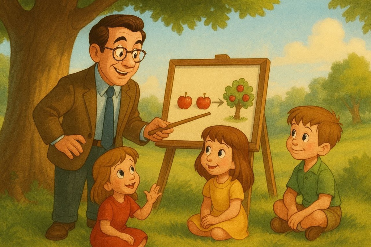 Каждое утро Сергей выходил на площадь с большой кожаной тетрадью. Там он чертил графики, рисовал стрелки, круги и линии, которые выглядели для детей как таинственные узоры. Ребята сбегались к нему, ведь у Сергея было правило: любую сложную вещь он объяснял так, чтобы даже самый маленький слушатель понял.