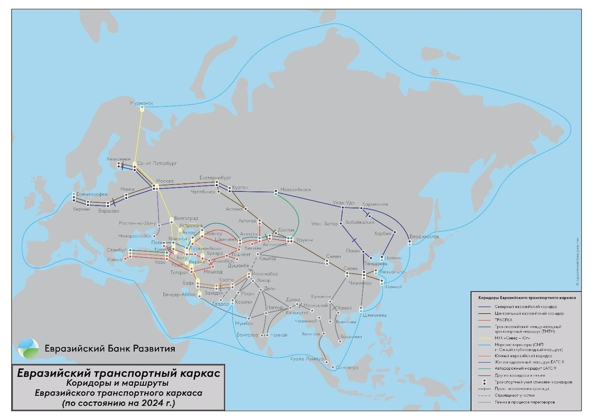 На этом фоне Россия продолжает продвигать в рамках Евразийского транспортного каркаса (ЕТК) международный транспортный коридор (МТК) «Север-Юг». Так, Евразийский банк развития (ЕАБР) разработал и месяц назад представил «Обсерваторию транспортных проектов» — инструмент для мониторинга и скоординированного развития инфраструктуры в рамках реализации концепции ЕТК. Обсерватория — это база данных и интерактивная карта проектов развития транспортных коридоров в 13 странах Евразийского региона, включая Армению, Азербайджан, Афганистан, Беларусь, Грузию, Иран, Казахстан, Кыргызстан, Монголию, Россию, Таджикистан, Туркменистан и Узбекистан. По состоянию на 1 июля 2025 года, она насчитывает 325 проектов, как уже осуществляемых, так и планируемых, с общим объемом инвестиций более $234 млрд.