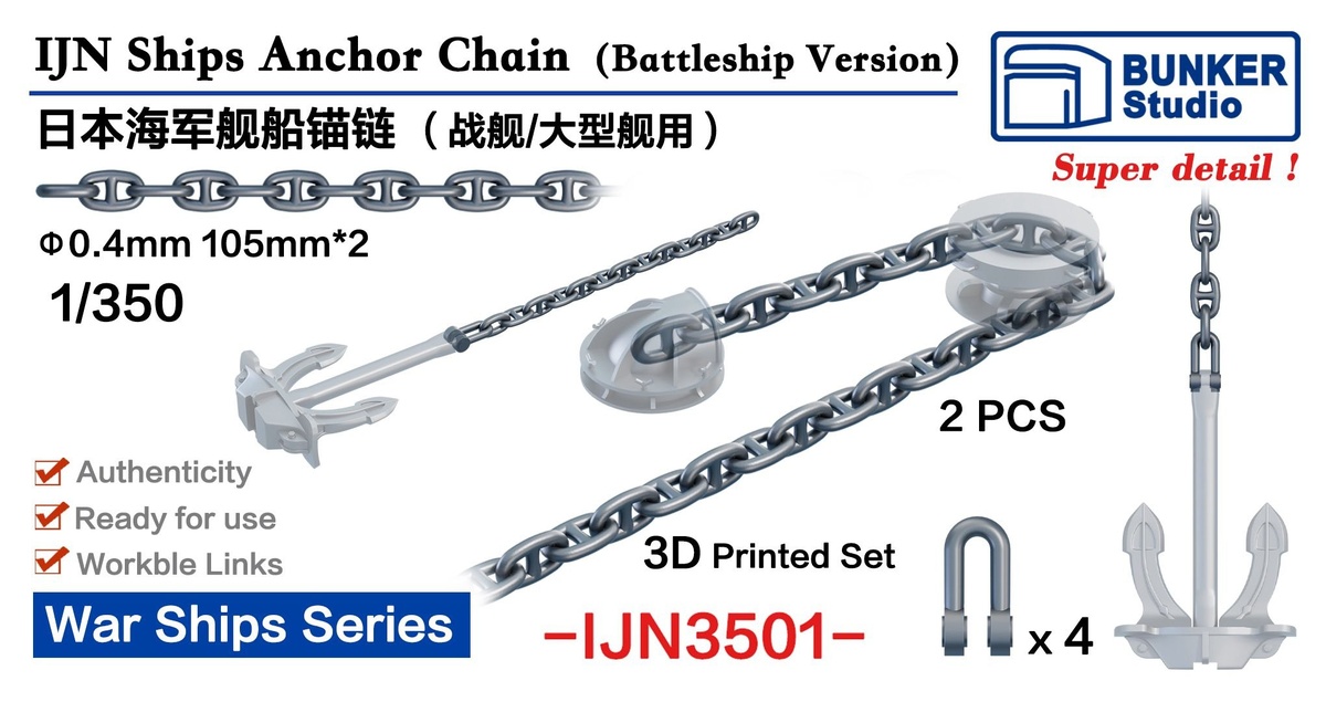 Китайская Bunker Studio выпустила на 3D-принтере якорные цепи для военных кораблей разных классов в масштабах 1/350 и 1/200.