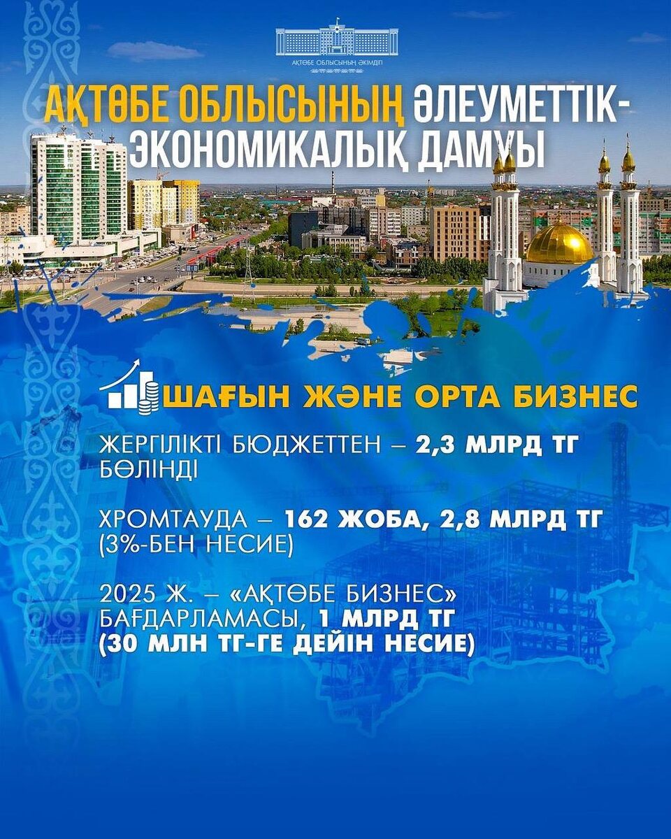 📊В 2025 году из местного бюджета было выделено 2,3 млрд тенге на поддержку предпринимателей. 🏛️На сессии областного маслихата аким области Асхат Шахаров подробно рассказал о мерах поддержки малого и среднего бизнеса в регионе и планах на будущее. ✔️Особое внимание глава региона уделил реализации региональной программы «Актобе Бизнес», которая планируется к запуску в этом году. Эта программа реализуется через СПК «Актобе» и рассчитана на сумму 1 млрд тенге. В ее рамках предприниматели смогут получить кредиты до 30 млн тенге для развития своего дела. 💬«Программа «Актобе Бизнес» станет важным шагом в создании благоприятных условий для малого и среднего бизнеса. Мы стремимся поддержать предпринимателей, чтобы они могли развивать свои проекты, создавать рабочие места и укреплять экономику региона», – подчеркнул аким. 🏭Также в прошлом году в моногороде Хромтау была успешно запущена региональная программа кредитования под 3%. По ней уже одобрено 162 проекта на сумму 2,8 млрд тенге.