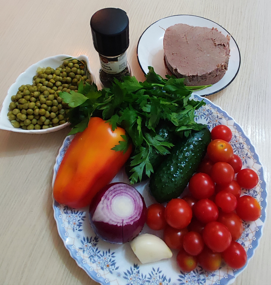 Друзья, всем доброе утро! Хорошего солнечного дня и отличного настроения!Сегодня предлагаю вам приготовить вместе со мной питательный салат с говядиной. Это полноценный, сбалансированный и очень вкусный салат. Больше всего подходит для ужина, приготовил такой салат и вся семья сыта. И на праздничном столе он займёт не последнее место. Готовить такой салат очень быстро, ну за исключением времени на варку мяса. Для приготовления нам понадобится: отварная говядина 200гр., один болгарский перец, 2 средних огурца, 1 зубчик чеснока, 1 салатная луковица, 15 шт.помидоров черри, небольшой пучок петрушки, 200 гр. консервированного зелёного горошка, соль, перец и растительное масло для заправки. Мясо для этого салата нарезаем полосками, также полосками режем перец, черри режем пополам, лук нарезаем четверть кольцами, петрушку и чеснок стараемся порезать помельче. Складываем все ингредиенты в салатник. Чеснок кладëм последним. И теперь фишка этого салата. Масло для заправки нужно хорошо разогрет