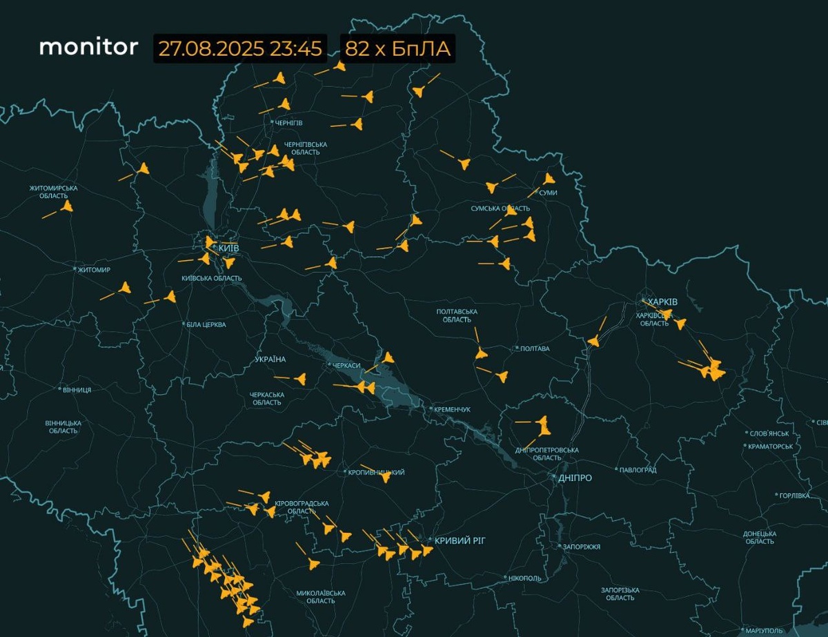 "Π’Π°Π±ΡΠ½ Π½Π° ΠΠΈΠ΅Π²/ΠΎΠ±Π»Π°ΡΡΡ ΠΈ ΡΠ°Π±ΡΠ½ Π½Π° ΠΠΈΠ½Π½ΠΈΡΠΊΡΡ ΠΎΠ±Π»Π°ΡΡΡ. Π§Π°ΡΡΡ Π΄ΡΠΎΠ½ΠΎΠ² ΠΎΠ±ΠΎΡΠ»Π° ΠΠΈΠ΅Π² ΠΊΡΡΡΠΎΠΌ Π½Π° Π·Π°ΠΏΠ°Π΄. ΠΠΎΠΏΠ°Π΄Π°Π½ΠΈΠ΅ 3-Ρ ΡΠ°ΠΊΠ΅Ρ Π±ΡΠ»ΠΎ Π² ΠΡΡΠ³ΠΎΡΠΎΠ΄ΡΠΊΠΎΠΌ ΡΠ°ΠΉΠΎΠ½Π΅ ΠΠΈΠ΅Π²ΡΠΈΠ½Ρ".