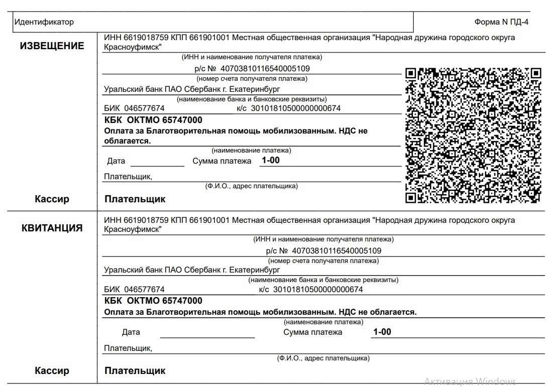Жители Красноуфимска продолжают поддерживать земляков, участвующих в специальной военной операции. С 10 августа по 10 сентября в городе проходит акция «Красноуфимск — всё для Победы». Акцию организуют муниципальный штаб по оказанию помощи военнослужащим и мобилизованным гражданам и членам их семей «Мы вместе» совместно с МБУ «Патриот», Администрацией города и народной дружиной Красноуфимска. Цель акции — сбор средств на закупку технического оборудования и строительных материалов для нескольких воинских подразделений и госпиталя в ДНР. Как помочь? 1. Финансовая поддержка: