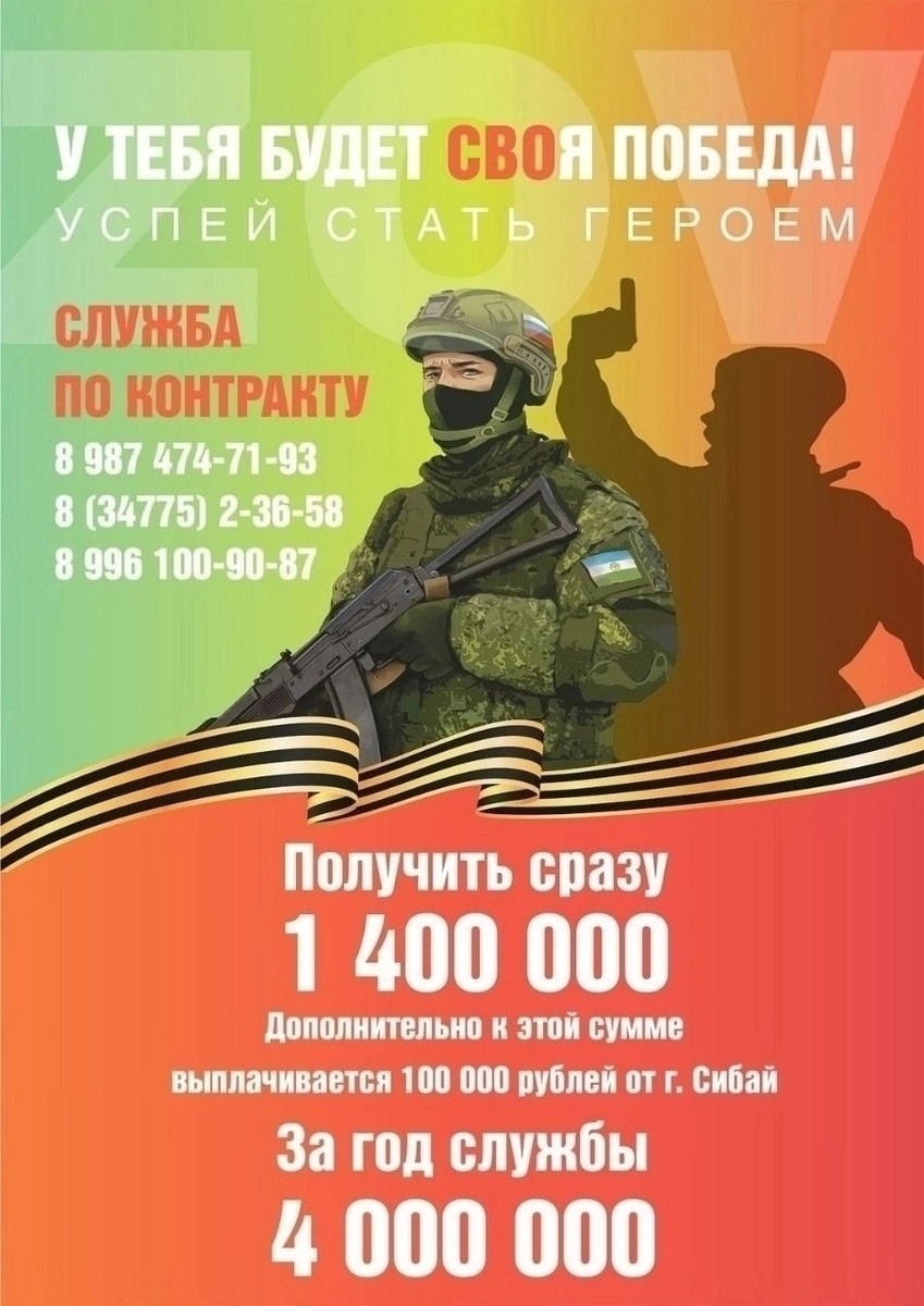 СВОих не бросаем! Получи сразу 1 400 000 руб + 100 000 руб от г. Сибай Для поступления на службу по контракту необходимо обратиться в военкомат по адресу: г. Сибай, ул. Пионерская, 7, тел. 8-987-474-71-93; 8 (34775) 2-36-58; 8-996-100-90-87. #Сибай #СВО
