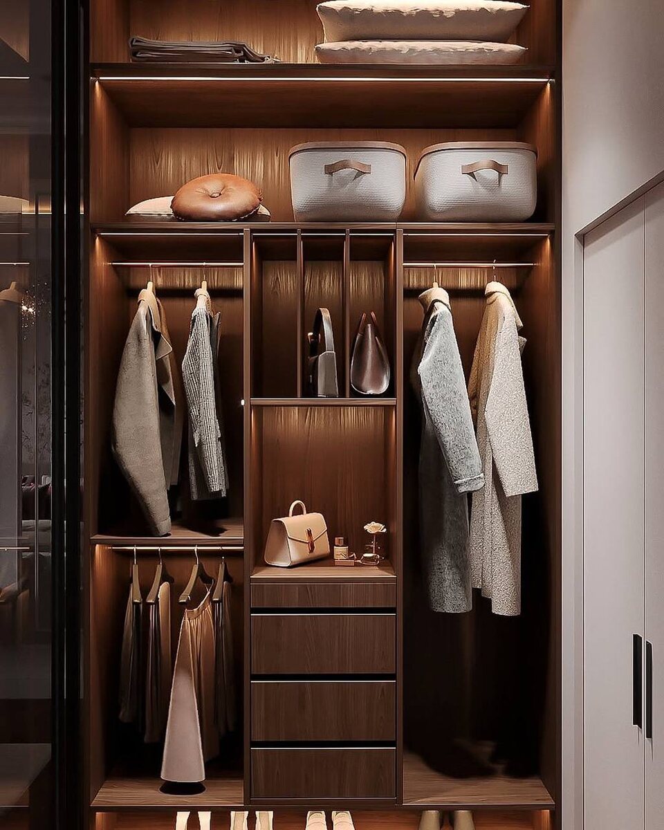 Минимальная площадь для гардеробной — 3 м². Миф или реальность? Многие думают, что гардеробная — это роскошь для больших домов. На самом деле функциональную гардеробную можно сделать даже на 3 м²! Что можно разместить на такой площади? • Две полноценные штанги для одежды (длинные и короткие вещи). • Систему полок для обуви и сумок. • Пару ящиков для мелочей и аксессуаров. • Освещение и зеркало для удобства. Почему это удобно? • Освобождает комнаты от громоздких шкафов. • Упорядочивает хранение — всё под рукой и на виду. • Делает квартиру визуально просторнее. Совет: идеально планировать гардеробную на этапе ремонта — предусмотреть ниши, розетки, свет и вентиляцию. Нежный дизайн спальни с гардеробной #идеидизайн Дизайн - JULIA BAYA А вы бы хотели маленькую, но удобную гардеробную или предпочитаете классические шкафы? 🚧 ПОДПИСАТЬСЯ | ТЕХНОЛОГИЯ РЕМОНТА | ВСЕ О РЕМОНТЕ