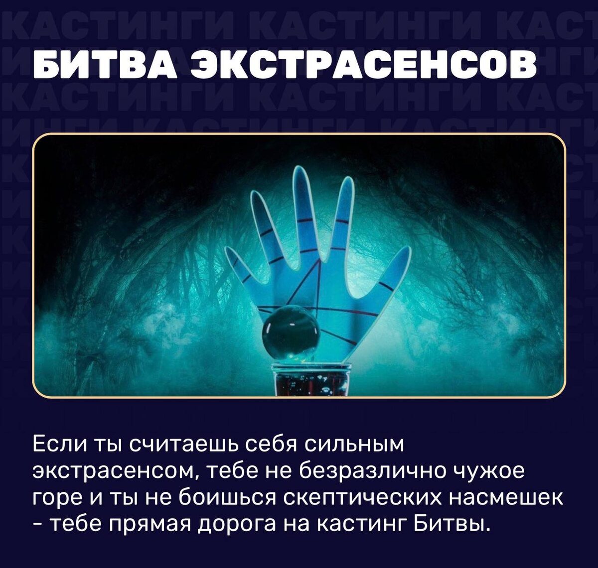 Если ты уверен, что твой дар может изменить представление о мире, приходи на кастинг Битвы экстрасенсов.