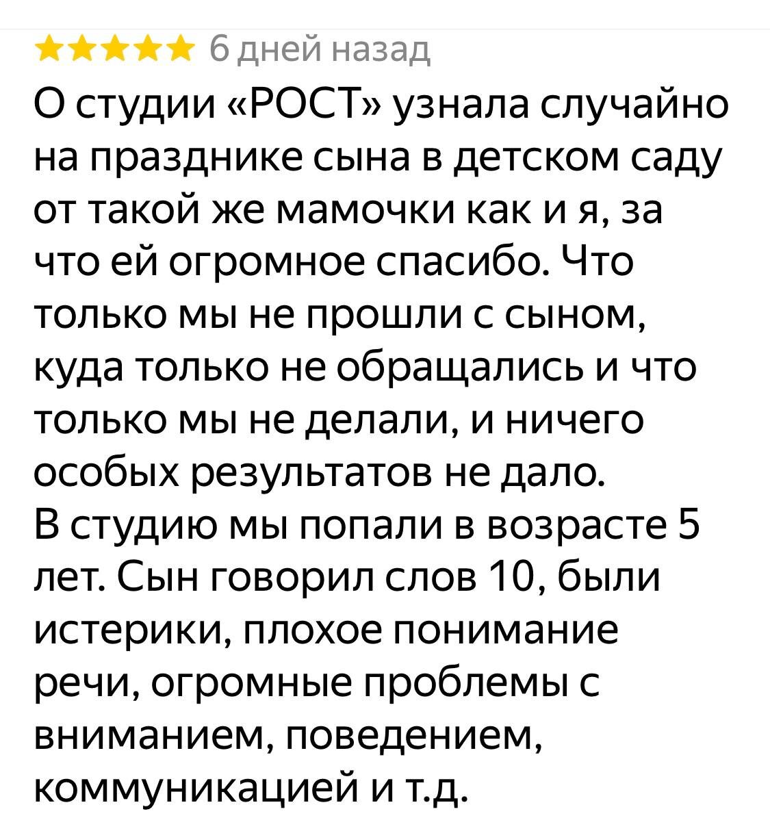 Мама нашего маленького клиента (см. скрины нового отзыва в Яндексе) уже отчаялась решить проблему с задержкой речи и поведением ребёнка, как вдруг на детском утреннике мама другого ребёнка с подобной проблемой, которая уже успешно её решает с нами, поделилась с ней нашими контактами.