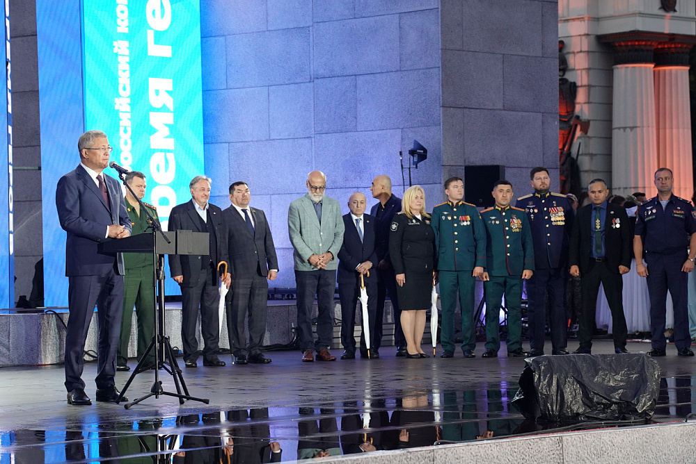 В Уфе, на Советской площади, состоялись заключительные мероприятия IV Всероссийского открытого песенного конкурса патриотической направленности «Время героев». Событие было приурочено ко дню рождения Минигали Шаймуратова, генерал-майора, Героя России и командира прославленной 112-й Башкирской кавалерийской дивизии. Глава Башкортостана Радий Хабиров принял участие в церемонии. Вместе с почетными гостями руководитель республики возложил цветы к монументу Минигали Шаймуратову. Этот мемориальный комплекс, открытый 11 октября 2022 года, является данью памяти не только воинам 112-й Башкавдивизии, но и всем гражданам, отдавшим жизни за Отечество. Радий Хабиров также обратился с приветствием к участникам Всероссийского конкурса «Время героев», который в этом году проходит в рамках Дней армейской культуры и посвящен 80-летию Великой Победы. В своей речи он отметил, что в этот день отмечается 126-я годовщина со дня рождения Минигали Шаймуратова, и проведение финала конкурса «Время героев» в этот