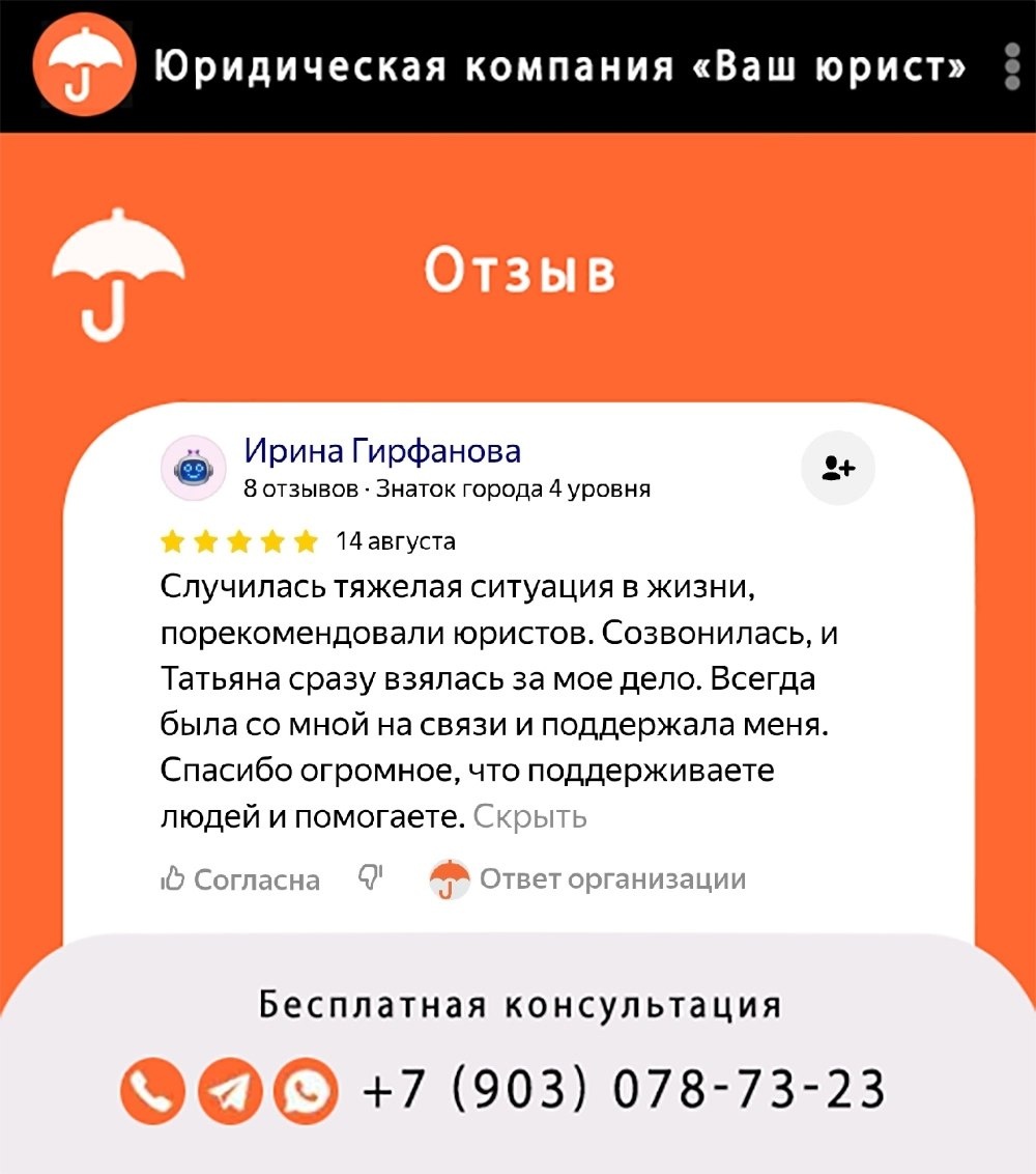 От всей души благодарим вас за ваши добрые слова и положительные отзывы. Ваше доверие и признание нашей работы являются для нас главной наградой и стимулом для дальнейшего развития и совершенствования. С благодарностью, юк "Ваш юрист".