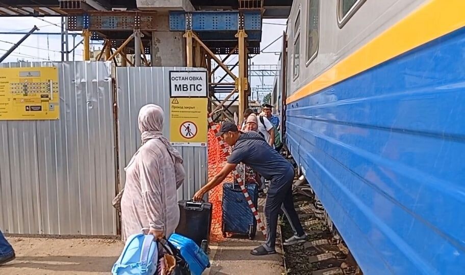 Особенно напряженная ситуация возникла во время прибытия международного поезда из Казахстана. Двери двух вагонов пришлись прямо на строительную площадку, где оставалось не более 50 сантиметров пространства. Из этих дверей начали массово выходить пассажиры – женщины с тяжелыми сумками, дети, мужчины с баулами. Возникла давка: люди не могли разойтись, потоки сталкивались, кто-то пытался протиснуться к подземному переходу, кто-то – обратно к мосту.