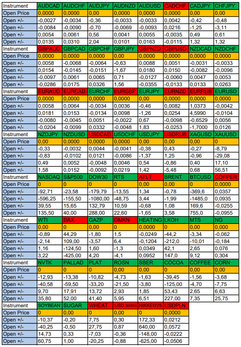 Весь перечень анализируемых активов указан ниже в общем количестве 62 инструмента. Здесь Вы найдете активы рынка Форекс, популярные активы Московской биржи, не менее популярные активы Чикагской биржи СМЕ и мажор криптовалютного сегмента - Биткоин, за которым следуют все альткоины.