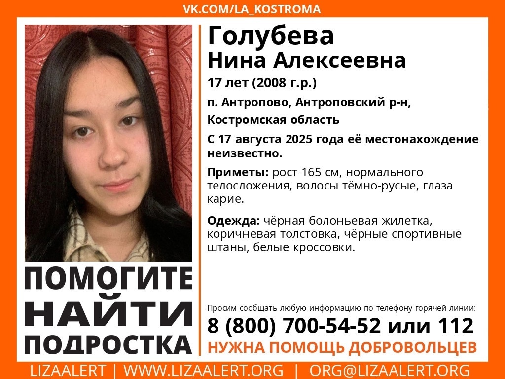 О 17-летней Нине Голубевой ничего неизвестно с 17-го августа В Костромской области ищут 17-летнюю Голубеву Нину Алексеевну. Как сообщает местный поисково-спасательный отряд «ЛизаАлерт», о подростке ничего неизвестно с 17-го августа. Основные приметы разыскиваемой: рост 165 сантиметров, нормальное телосложение, темно-русые волосы, карие глаза. Юная девушка была одета в черную болоньевую жилетку, коричневую толстовку, темные спортивные штаны и белые кроссовки. По данным добровольцев, Нина может находиться в районе поселка Антропово. Принять участие в поисках может любой желающий, телефон для связи: +7 (800) 700-54-52.