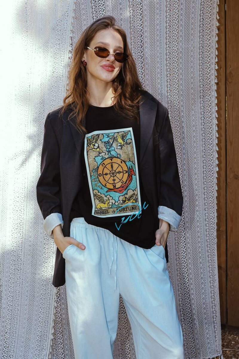 Футболка “Колесо Фортуны” - 4500₽ Жизнь меняется мгновенно. Сегодня ты на вершине, завтра — пробуешь новые дороги, а потом снова поднимаешься выше. “Колесо Фортуны” — про движение, смелость и принятие перемен. Про умение доверять потоку и находить свой путь, даже если всё вокруг кажется хаотичным. ✔️Этот символ — напоминание: не бойтесь нового. Коллекция DNK ТАРО уже в продаже. Выбирайте свою карту.