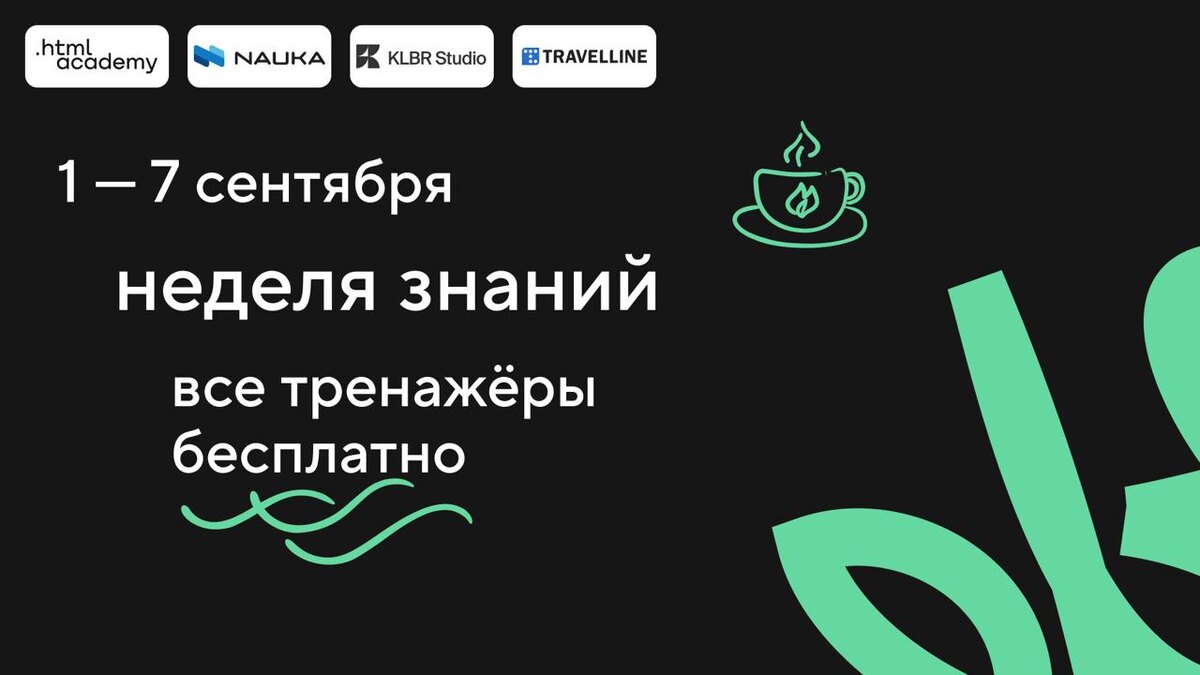 📚 Сентябрь — лучший повод прокачать фронтенд! 1–7 сентября проводим неделю знаний от HTML Academy. Вместе с нашими партнёрами-работодателями — NAUKA, KLBR Studio и TravelLine — на неделю открываем бесплатный доступ к тренажёрам с заданиями и испытаниями. Вызовы и мастер-классы — по активной подписке; баллы за них учитываются в общем зачёте. Что вас ждёт? — 895 заданий и 151 испытание по HTML, CSS, SVG и JavaScript. — Рейтинг: выполняйте задания и испытания, поднимайтесь в топ-30. — Викторина на неделю — 200 вопросов, баллы за правильные ответы. Зовите друзей, проходите задания и повышайте шансы на призы. Подробнее — на лендинге. Стартуем 1 сентября — удачи! Подробнее об акции | Telegram-бот