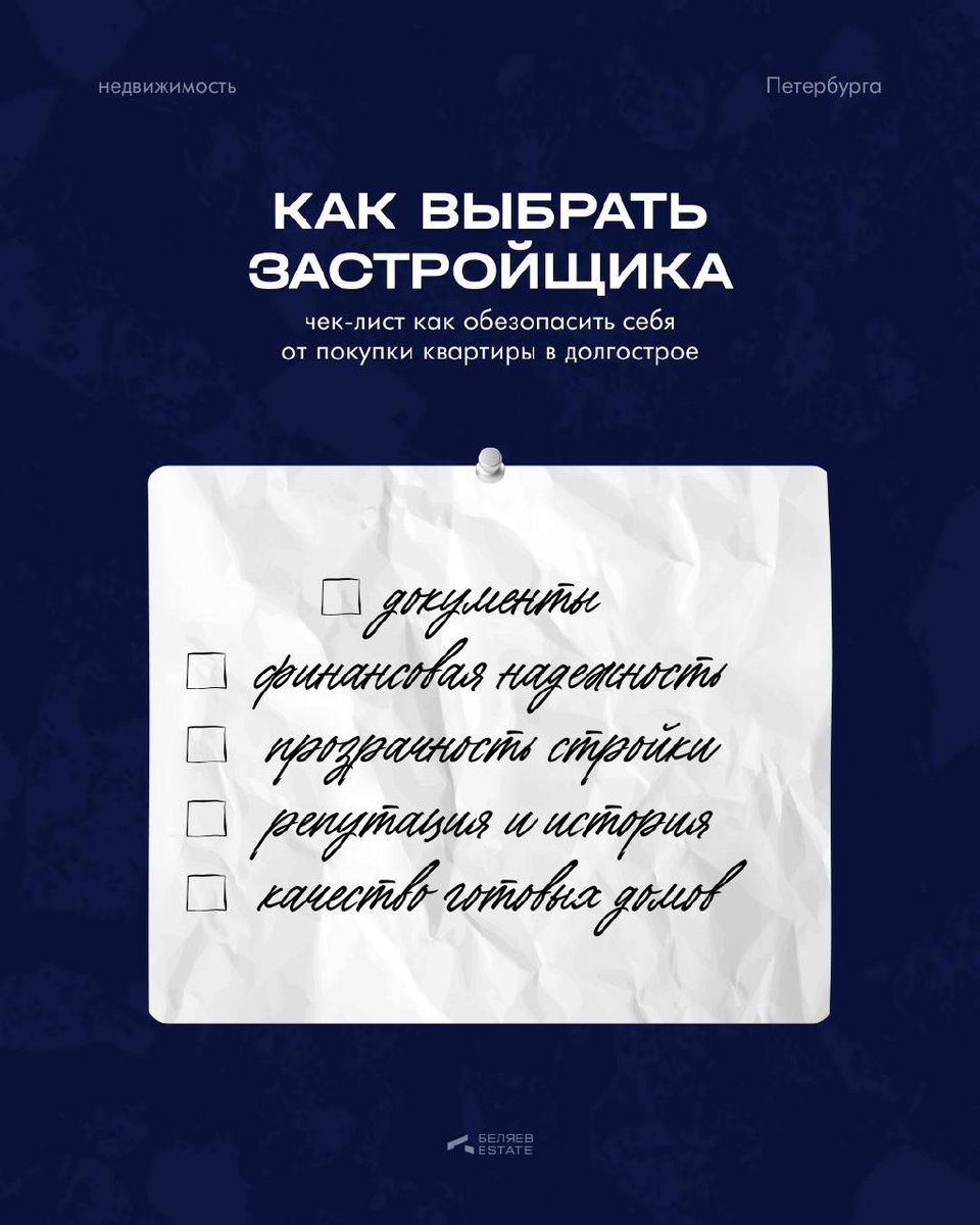 Чек-лист: как случайно не выбрать квартиру в долгострое Есть истории, когда долгожданные ключи становятся результатом десятилетнего марафона ожидания — и это не та дистанция, которую выбирают осознанно. Чтобы покупка квартиры не превращалась в квест с непредсказуемым финалом, лучше заранее вооружиться критериями проверки застройщика. На что смотреть? 📌 Документы Запросите разрешение на строительство, посмотрите документы на землю, изучите проектную декларацию: там вся суть — от площади дома до того, где именно появятся парковки и детские площадки. 📌 Финансовая надёжность Проверьте, работает ли застройщик с крупными банками, есть ли у него проекты, которые успешно сдаются. Постоянные заморозки — красный флаг. 📌 Прозрачность стройки Есть сервис, где видна динамика строительства: сколько квартир уже продано, были ли задержки. Это помогает отделить обещания застройщика от реальности. 📌 Репутация и история Откройте официальный сайт: как компания рассказывает о себе, своих объектах