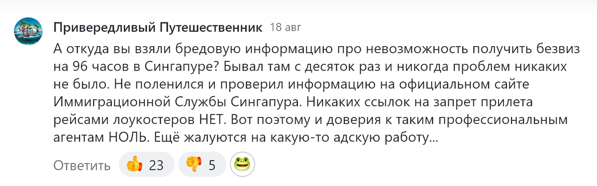 И меня очень заинтересовал этот вопрос, так как Сингапур - один из моих самых любимых городов и бывал я там не менее десятка раз. Всегда посещал безвизовым транзитом без каких-либо проблем. Может действительно что-то поменялось в правилах? И начал выяснять, пытаясь найти достоверную информацию. Оказалось, что изложенная информация турагентом в статье от 18 августа 2025 года, оказалась ложной. В результате написал комментарий к этой статье, который набрал сразу приличное количество лайков.