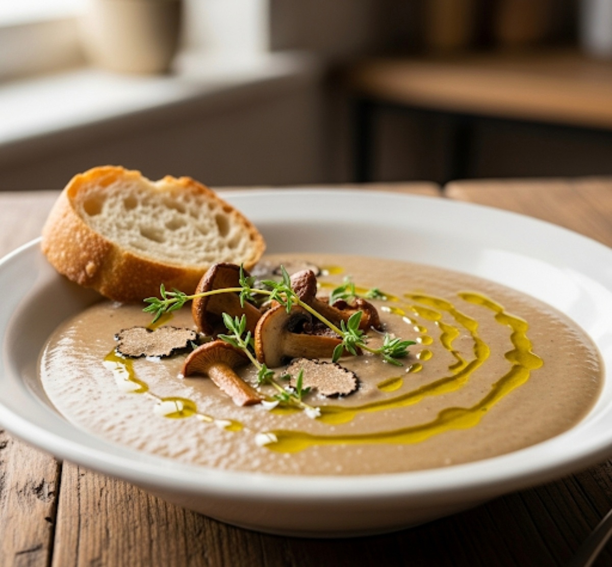 Ингредиенты: * 500 г шампиньонов * 1 большая луковица * 2 зубчика чеснока * 1 л овощного или куриного бульона * 200 мл сливок 33% * 2 ст. л. сливочного масла * Соль, чёрный перец по вкусу * Трюфельное масло для подачи * Свежая петрушка для украшения Приготовление: * Мелко нарежьте лук и чеснок. Грибы нарежьте ломтиками. * В кастрюле растопите сливочное масло, обжарьте лук до мягкости. Добавьте чеснок, готовьте ещё минуту. * Выложите грибы, готовьте на среднем огне, пока они не уменьшатся в объёме и не станут золотистыми. * Влейте бульон, доведите до кипения и варите 10-15 минут. * С помощью блендера измельчите суп до однородного состояния. * Влейте сливки, доведите до кипения, но не кипятите. Посолите и поперчите. * Разлейте суп по тарелкам, добавьте несколько капель трюфельного масла и украсьте рубленой петрушкой. Приятного аппетита!
