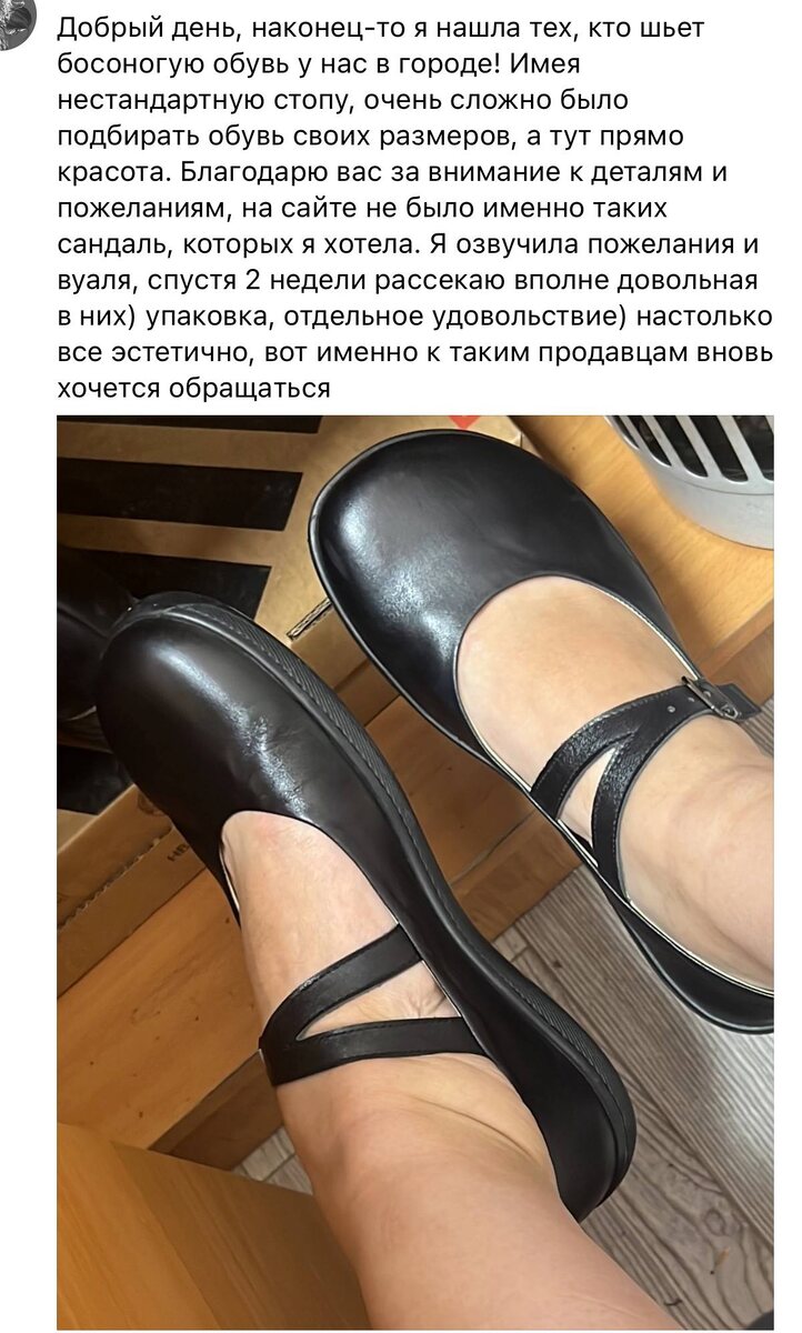 Когда стандартные размеры не подходят, каждая новая пара обуви становиться испытанием. Наша босоногая обувь Alesandro Vitorio создаётся именно для того, чтобы дарить комфорт и свободу даже нестандартным стопам. Одна из наших клиенток поделилась: «На сайте не было именно таких сандалий, которые я хотела. Я озвучила пожелания и через 2 недели получила именно ту пару, о которой мечтала. Настолько всё эстетично и красиво, что именно к таким продавцам хочется обращаться снова». В этом и есть суть ручной работы: 🫶 мы учитываем ваши пожелания, 🫶 подбираем форму и материал, 🫶 создаём пару, которая идеально садится именно на вашу стопу. 📦 А ещё уделяем внимание каждой детали от анатомической формы до упаковки, которая сама по себе вызывает радость. 🫶 Если у вас есть пожелания к материалу, цвету или исполнению модели напишите нам @alesvito, и мы предложим подходящее решение. 🫶Ссылка на отзыв https://vk.com/topic-140102682_38687348