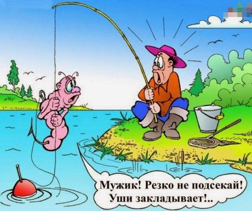 — Чего, всего одного поймал? 3. В ответ на призыв Росрыболовства к рыбакам практиковать принцип "поймал — отпусти", рыболовы обратились к чиновникам с призывом ввести у себя принцип "наворовал — верни". 4. Муж собирается на рыбалку. Скотчем приматывает бутылку водки к удочке.