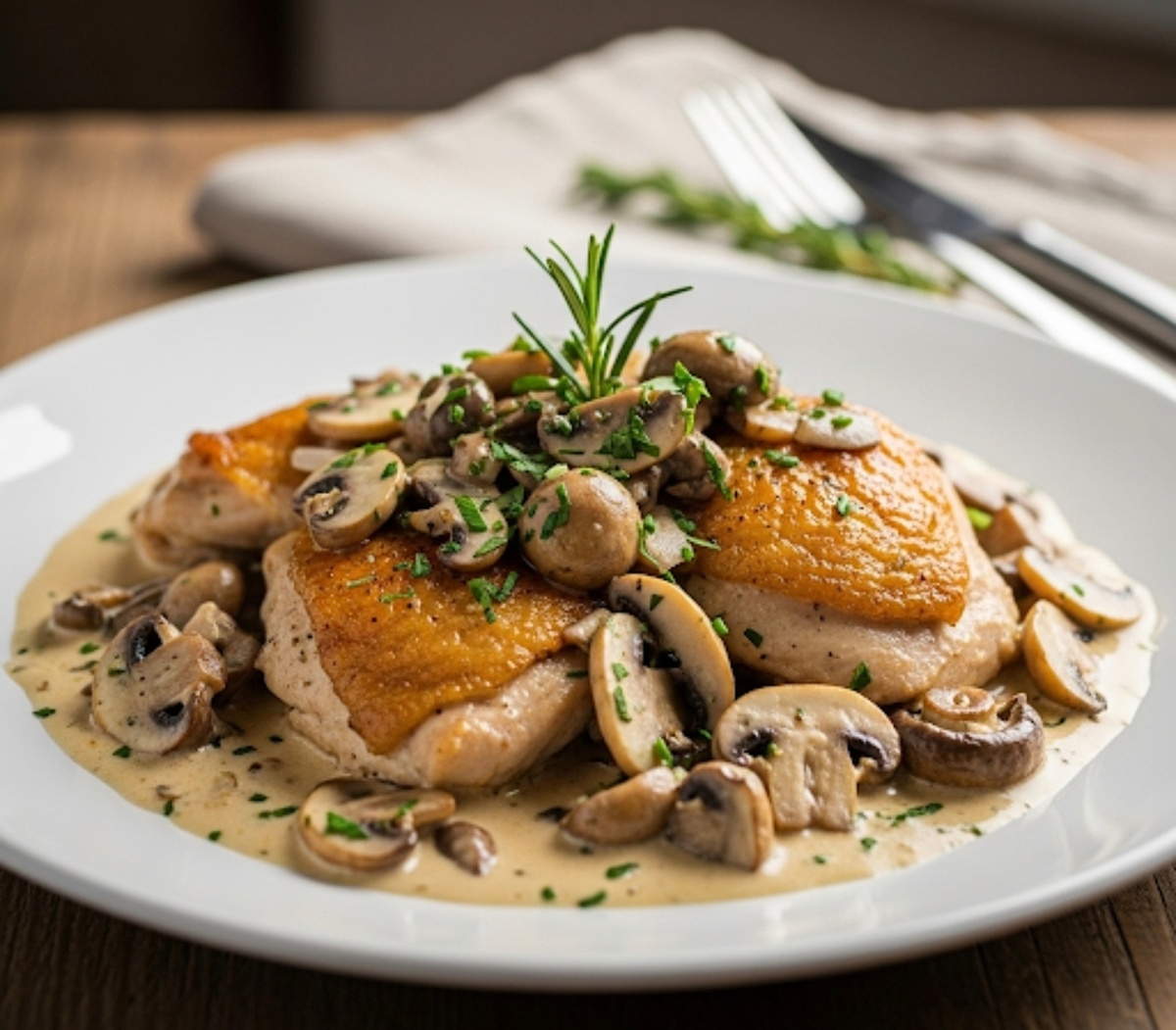 Ингредиенты: * 2 куриные грудки, нарезанные кубиками * 200 г свежих шампиньонов, нарезанных пластинками * 1 луковица, мелко нарезанная * 2 зубчика чеснока, измельчённых * 200 мл жирных сливок (33%) * 100 мл белого сухого вина * 50 г твёрдого сыра (пармезан или грана падано), тёртого * 2 ст. л. сливочного масла * 1 ст. л. оливкового масла * Свежая петрушка для украшения * Соль и чёрный перец по вкусу Приготовление: * Обжарка: В глубокой сковороде разогрейте оливковое и сливочное масло. Обжарьте курицу до золотистой корочки. Посолите и поперчите. Выложите курицу на тарелку. * Пассеровка: В той же сковороде обжарьте лук до мягкости, затем добавьте грибы и готовьте, пока они не уменьшатся в объёме. Добавьте чеснок и готовьте ещё 1 минуту. * Деглазирование: Влейте белое вино и доведите до кипения, постоянно помешивая. Готовьте, пока вино не выпарится наполовину. * Соус: Уменьшите огонь, добавьте сливки и курицу. Тушите на медленном огне 5-7 минут, пока соус немного не загуст