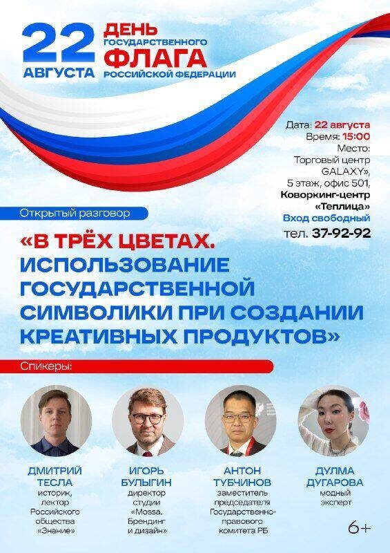 В День Государственного флага России в пройдет встреча о символике и креативных продуктах Мероприятие состоится 22 августа в 15:00 в "Коворкинг-центре Теплица", расположенном на 5 этаже торгового центра "GALAXY". Вход на мероприятие свободный, и все желающие смогут присоединиться к обсуждению. Не упустите возможность узнать больше о роли государственной символики в креативной индустрии и внести свой вклад в патриотическое движение! 6+