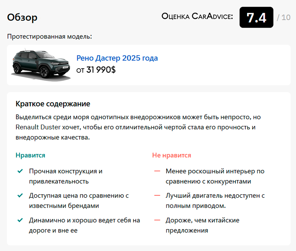 В конечном счёте, Renault Duster 2025 года — уникальное и необычное предложение на рынке, и это хорошо. Нам нравится его надёжный, внедорожный характер, при этом салон просторный и практичный — даже для семей.