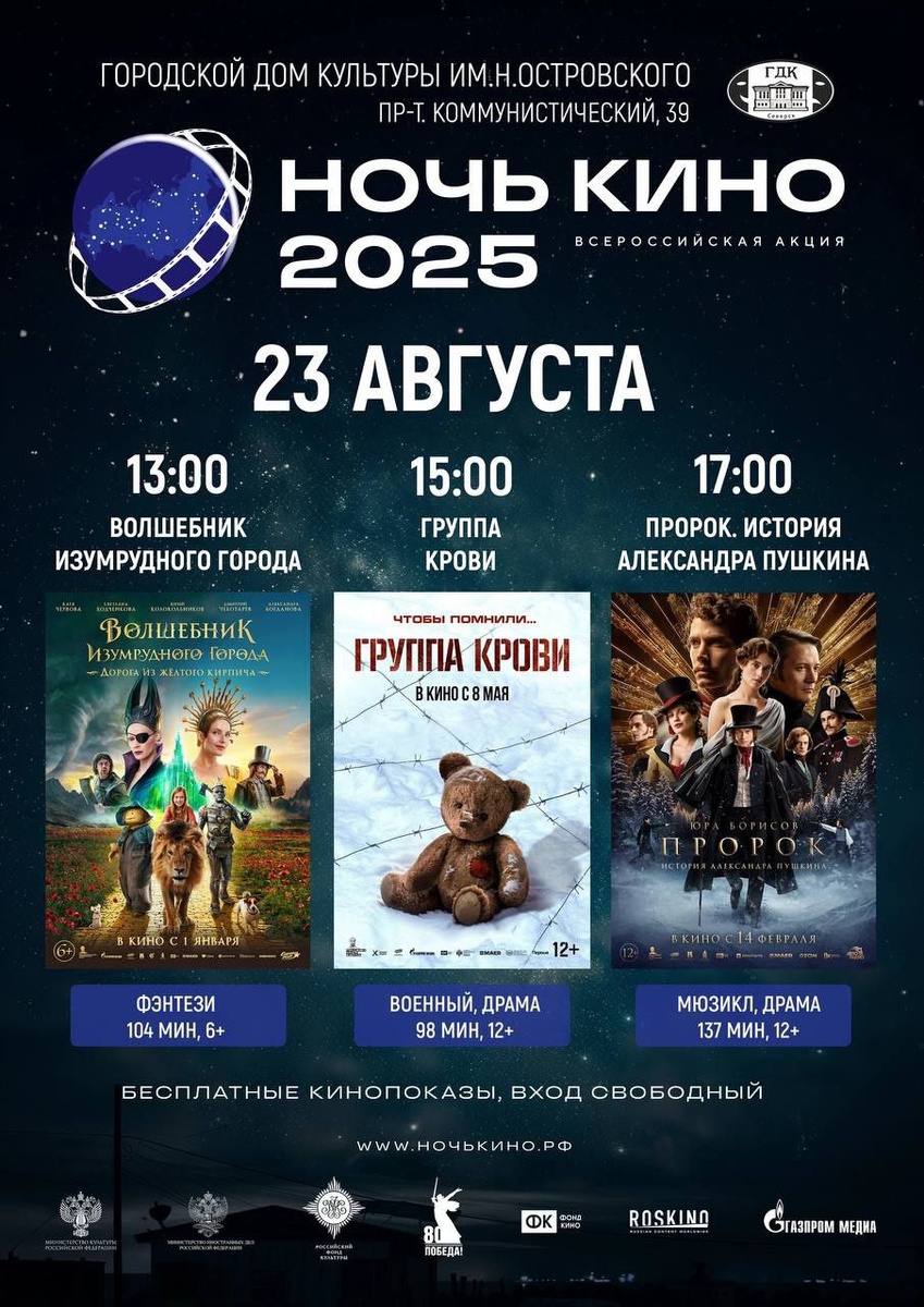 Северчан приглашают 23 августа в Дом культуры на бесплатные кинопоказы в рамках Всероссийской акции «Ночь кино-2025» Программа: - 13:00 – Семейное фэнтези «Волшебник Изумрудного города. Дорога из жёлтого кирпича» (2024, реж. Игорь Волошин, 104 мин., 6+). - 15:00 – Военная драма «Группа крови» (2025, реж. Максим Бриус, 98 мин., 12+) – в честь 80-летия Победы в Великой Отечественной войне. - 17:00 – Музыкальный байопик «Пророк. История Александра Пушкина» (2024, реж. Феликс Умаров, 137 мин., 12+). Вход свободный! #СеверскАфиша