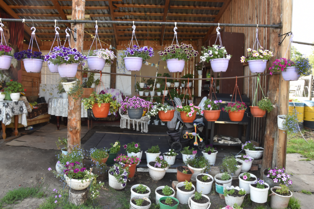 «Петунью ничто не затмит», – считает Анна Александровна Антипина из Больших Ключей. Женщина живёт в том же доме на два хозяина, что и Сафоновы. В ее палисаднике астры, циннии, однолетние георгины продолжают ряды цветов Юлии Михайловны. На фигурном ограждении в кашпо, напротив дома в клумбах – петунья. Всё это выдаёт, что хозяйка – любительница цветов. Но до какой степени она «больна» ими, по её выражению, можно представить, только попав во двор. Глаза разбегаются: с одной стороны вьюны, вдоль стены – клумбы, под навесом – несчётное количество кашпо, половина двора заставлена вазонами. «Сколько их?» – невольно удивляюсь я. Точного счёта не знает даже хозяйка. Предполагаю, что под сотню, а может, и больше. Действительно, чтобы возделывать такое «море», надо быть по-настоящему влюблённым в дело. «Больна» цветами Анна Александровна была всегда. Раньше в большом количестве сажала астры, георгины, циннии, а вот когда на рынке, примерно десять лет назад, появилась петунья, женщина своё сердце