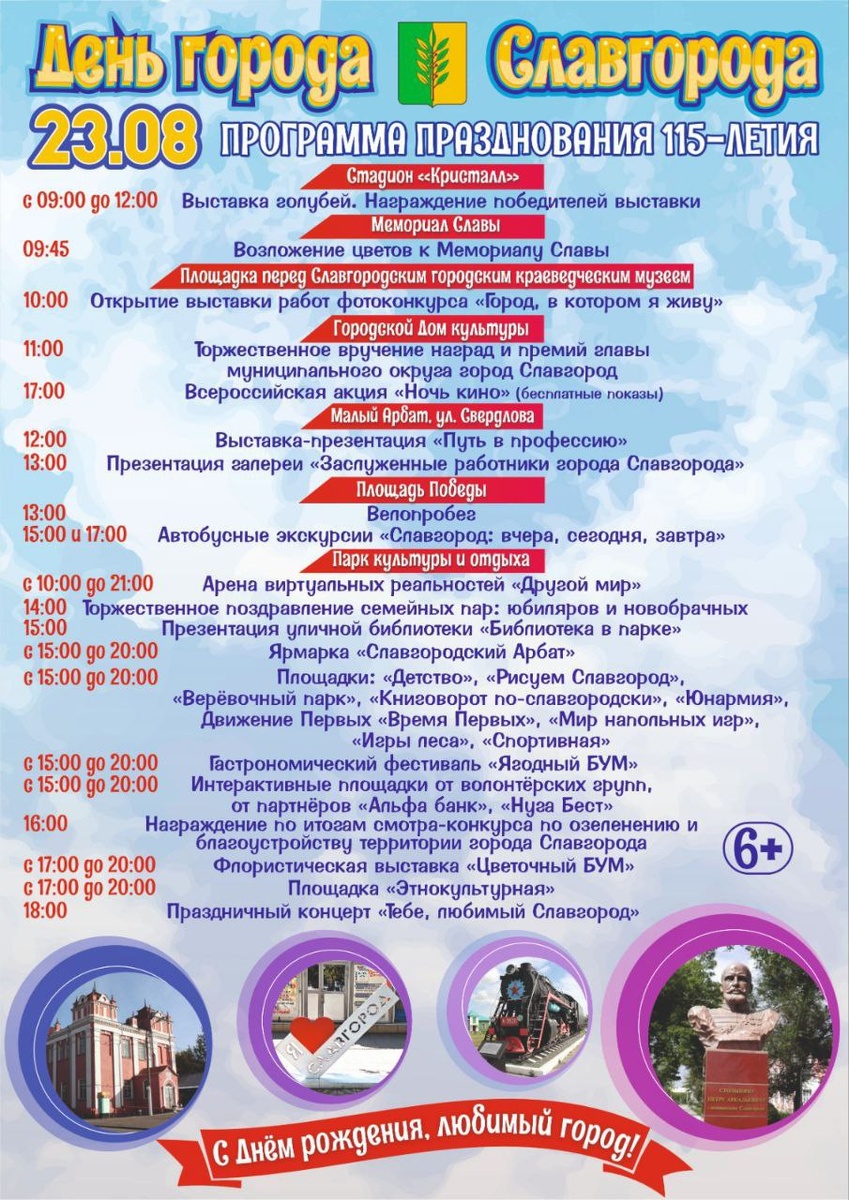 В Славгороде ожидается обширная культурная программа ко Дню города В этом году Славгороду исполняется 115 лет. Праздничные мероприятия начинаются уже 22 августа.В этот день ожидаются встреча с почетными и заслуженными работниками Славгорода, открытие выставки художников Алтайского края, спортивный марафон, концерт в честь Дня государственного флага РФ.23 августа – состоится вручение наград и премий главы муниципального округа город Славгород, выставки-презентации, велопробег, автобусные экскурсии.В торжественной обстановке поздравят семейные пары – юбиляров и новобрачных. В городском парке в течение дня будут работать творческие, спортивные площадки.Также состоится гастрономический фестиваль «Ягодный бум».Завершится День города праздничным концертом.Газета «Славгородские вести».... Ссылка на публикацию #День #города
