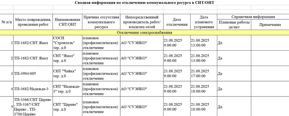 Информация по плановым отключениям в СНТ/ДНТ на 21.08.2025 от ЕДДС города Тюмени