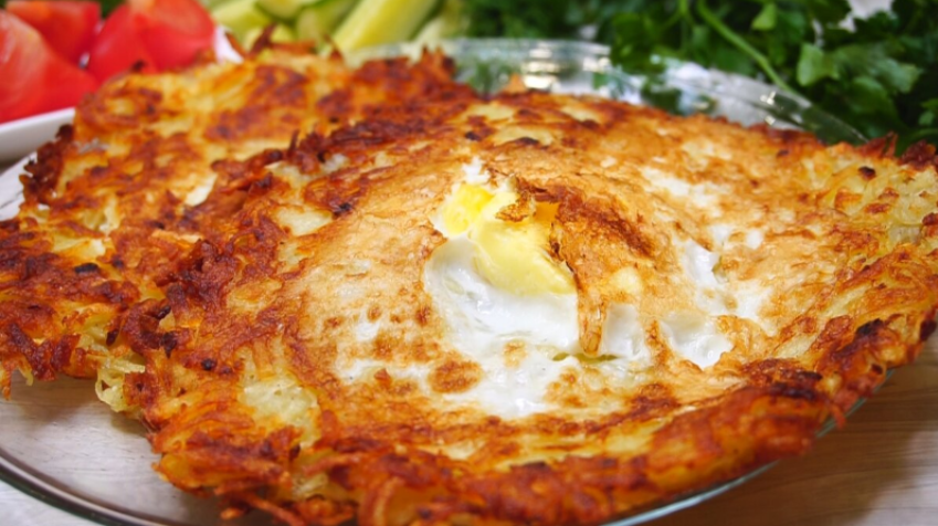 Картофель хорошо держит форму, поэтому с переворачиванием проблемы нет. Снимаем картофельный блин и жарим аналогично второй. Подаем с пылу с жару к столу со свежими овощами. Приятного аппетита! Видео версию смотрите ниже👇