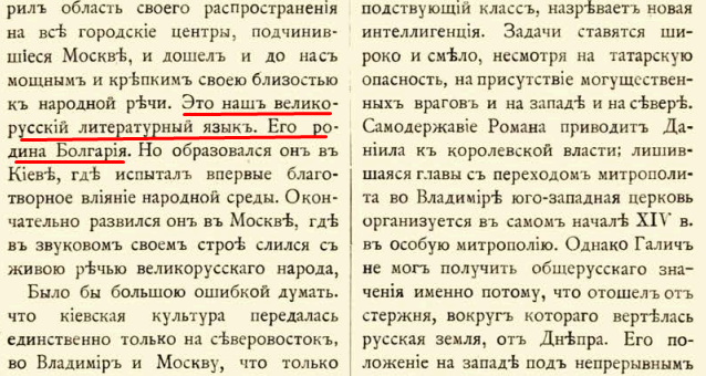 Здесь Шахматов снова говорит, что изначально т. н. Русский язык - это болгарский язык, который пришёл в Московию как церковнославянский, и изначально он говорил только в образованных классах, и только потом его уже освоили аборигены. Ранее Шахматов говорил об этом в своем " Кратком очерке истории украинского языка": " Это наш великорусский литературный язык. Его родина - Болгария ". «Украинский народ в его прошлом и настоящем», Т. 2, стр. 704. «Таким образом, в настоящее время наш литературный язык должен быть признанным одним из великорусских наречий (московским наречием ), обнаруживающим его в составе, во-первых, свою первоначальную природу (церковнославянизмы ), во-вторых, наши древнейшие судьбы на Руси (южноруссизмы, украинизмы). Следовательно, определив и выделив из нашего литературного языка те и другие элементы, основные (церковнославянизмы) и наносные (украинизмы), мы сосредоточим наше исследование на том современном его облике, который определяется как великорусский». "Очерк